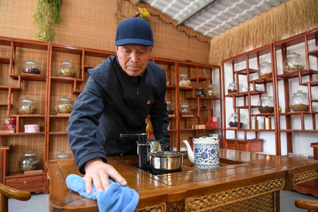 马克俊在自家开的茶馆里擦拭桌子(3月22日摄)。新华社记者 冯开华 摄