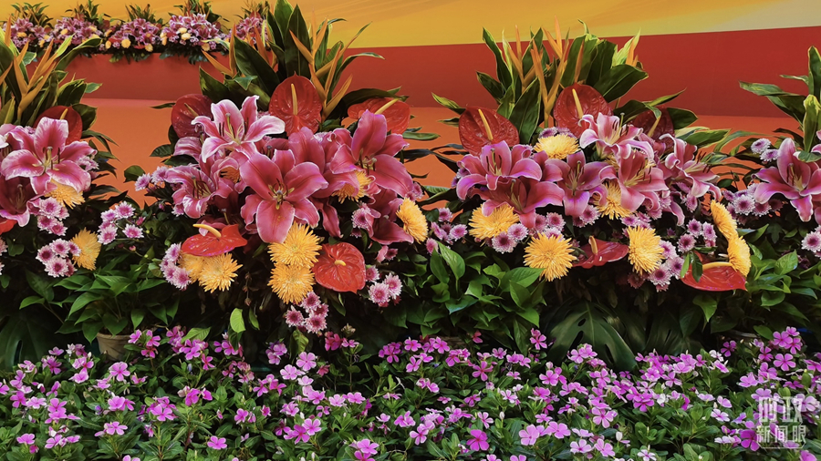 △庆祝大会现场摆放的鲜花。(总台央视记者范凯拍摄)