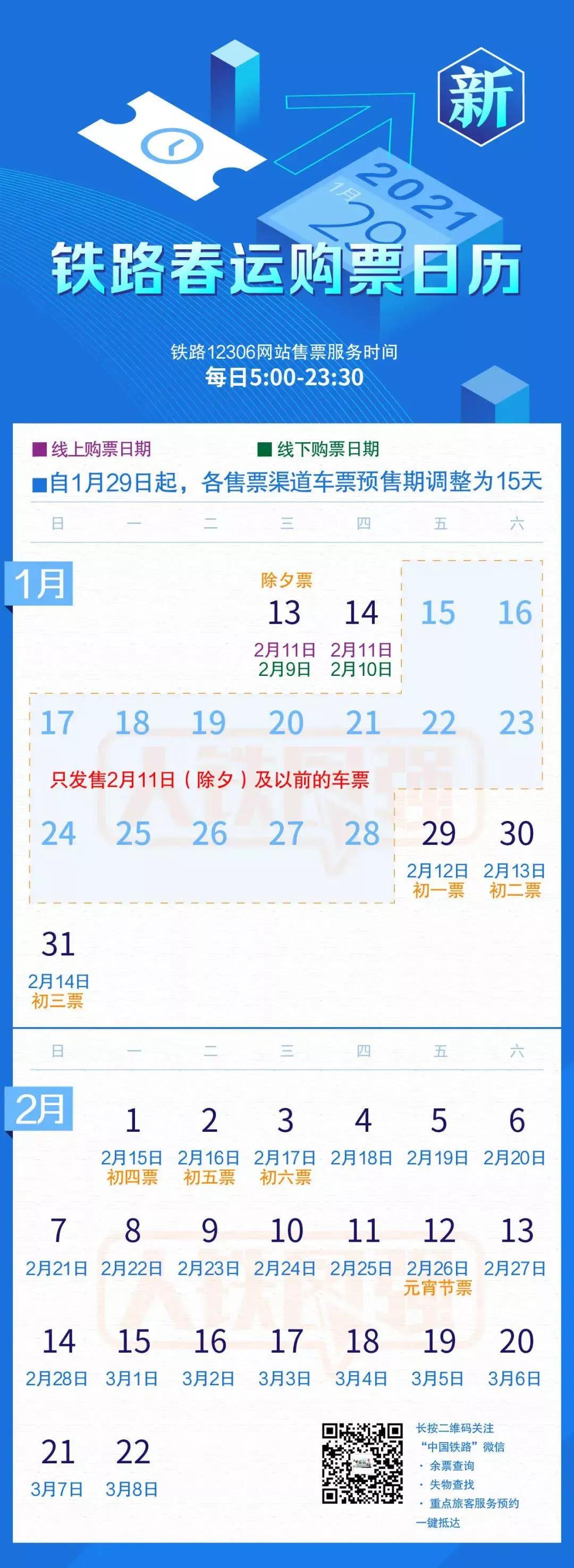 8.元宵节火车票开售,退票有新规:12日,2021年2月26日(元宵节)火车票开售。旅客可在起售时间通过12306网站、手机APP、铁路出行服务平台“掌上高铁”APP、电话订票等方式购买车票。退票方面,免收退票费的时间期限由原规定的开车前15天以上同比例调整为开车前8天(含当日)以上。(澎湃新闻)