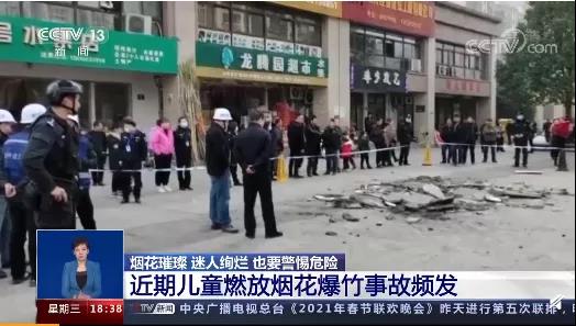 7.警惕!多地频发儿童燃放烟花爆竹事故:近期,浙江杭州两个孩子往下水道扔鞭炮路面被炸塌陷;在湖南长沙,有孩子把爆竹扔进平房内,引发火灾;广东佛山两个孩子在草地上放烟花点燃草地,过火面积约200平方米……烟花爆竹燃放时瞬间温度可达1000度以上,极易引发事故。提醒家长:看好孩子,平安过年!(央视新闻)
