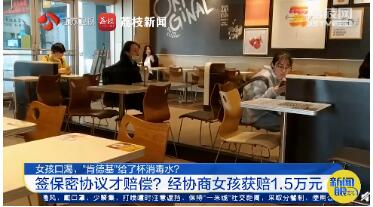 12.女孩肯德基就餐喝到消毒水,索赔时对方要求签保密协议:近日,苏州一家肯德基错把消毒水当冰水给女孩小杜饮用。小杜随后出现身体不适,被诊断为急性糜烂性胃炎和胃痉挛。肯德基餐厅在承担治疗费用后,表示只愿意再赔偿1000元,并要求小杜签保密协议。在执法部门介入调查后,肯德基表示将给予小杜15000元误工费补偿。(荔枝新闻)