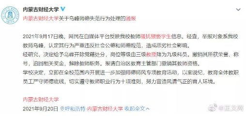 2.开除党籍,解除教职!大学教授因骚扰猥亵学生被处分:日前,内蒙古财经大学通报称,有网民在自媒体平台反映该校教师乌某骚扰猥亵学生的信息。经调查,校方认定乌某行为严重违反社会公德和师德规范,造成恶劣社会影响。经研究,决定给予乌某开除党籍处分,岗位等级由三级教授降为九级科员。撤销其所获荣誉、称号,追回相关奖金,解除教师职务,报请自治区教育主管部门撤销其教师资格。(正义网)