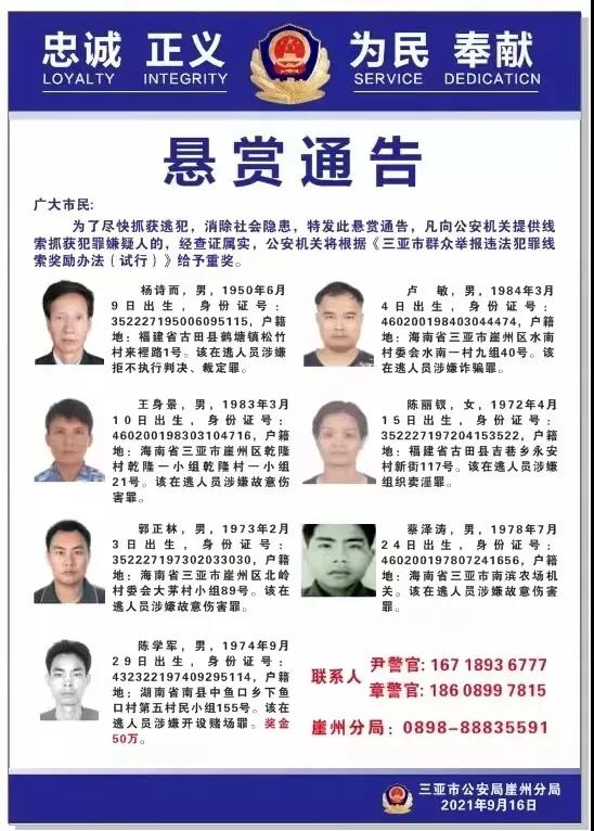 9.海南三亚警方发布悬赏通告:近日,三亚市公安局崖州分局发布一则悬赏通告,征集7名嫌疑人线索。据了解,7名在逃人员分别涉嫌拒不执行判决裁定、诈骗、故意伤害、开设赌场等。凡向公安机关提供线索抓获嫌疑人的,经查证属实,公安机关将给予重奖。其中,举报一名涉嫌开设赌场的在逃人员奖励50万元。(央视新闻)