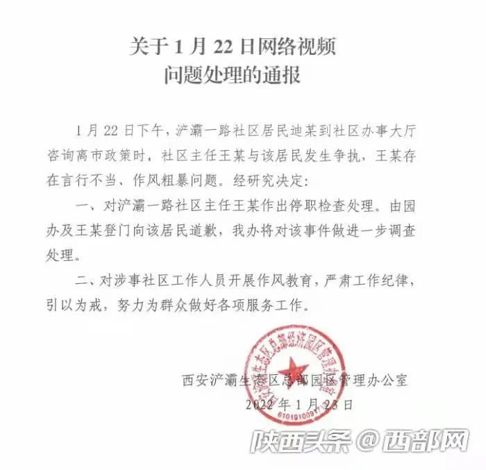 近日,网上一段“西安一社区领导怒怼咨询群众”的视频引发广泛关注。23日,陕西西安浐灞生态区总部园区管理办公室发布调查通报指出,22日,浐灞生态区浐灞一路社区居民迪某到社区办事大厅咨询离市政策时,社区主任王某与该居民发生争执,王某存在言行不当、作风粗暴问题。经研究决定,对王某作出停职检查处理,并由园办及王某登门向该居民道歉。(光明网)