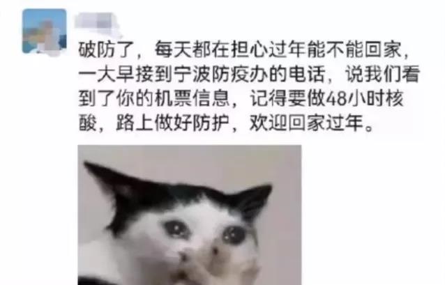 11.宁波防疫办一句话,令返乡网友大呼:破防了 23日,网传一张截图显示,在外地工作的宁波网友发朋友圈称,“破防了,每天都在担心过年能不能回家,一大早接到宁波防疫办电话,说看到机票信息,提醒要做48小时核酸,路上做好防护,欢迎回家过年”。消息一出,迅速登上热搜,网友纷纷喊话:“这才是故乡”。23日,据浙江宁波疾控中心疫情咨询电话客服称,低风险地区备好48小时内核酸阴性证明,和社区报备后可以正常返乡,希望大家都能平安回家过年。(北京青年报)