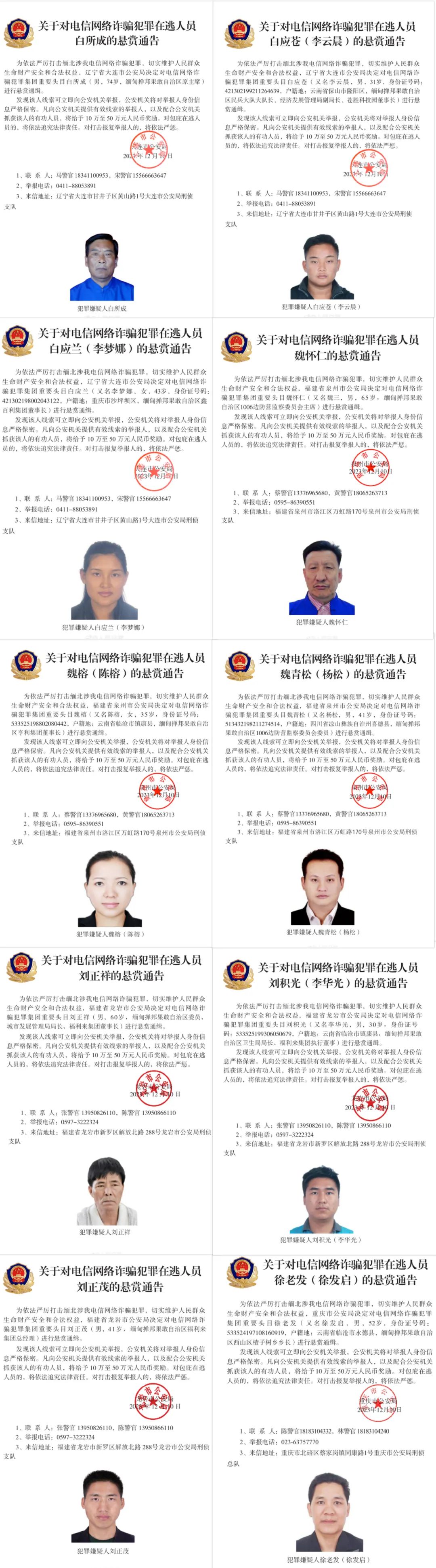 辽宁、福建、重庆等地公安机关在侦查中发现,以白所成、魏怀仁、刘正祥为首的3个家族犯罪集团和以徐老发为首的犯罪集团,长期实施针对中国公民的电信网络诈骗犯罪活动,诈骗数额巨大。为依法严厉打击缅北涉我电信网络诈骗犯罪,切实维护人民群众生命财产安全和合法权益,近日,辽宁省大连市公安局决定对白所成、白应苍(又名李云晨)、白应兰(又名李梦娜)进行公开悬赏通缉;福建省泉州市公安局决定对魏怀仁、魏榕(又名陈榕)、魏青松(又名杨松)进行公开悬赏通缉;福建省龙岩市公安局决定对刘正祥、刘积光(又名李华光)、刘正茂进行公开悬赏通缉;重庆市公安局决定对徐老发(又名徐发启)进行公开悬赏通缉。希望社会各界群众积极举报,协助抓捕犯罪嫌疑人。对提供有效线索和协助抓捕的有功人员,公安机关将给予10万至50万元人民币奖励。(人民日报)
