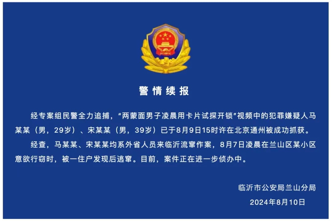 近日,一则“两蒙面男子开锁”的视频在网上传播,视频显示,凌晨3点,两名男子挨家挨户用卡片试探开锁,一个人在后面把风,一个人尝试撬门,该视频引起热议。临沂市公安局兰山分局8月9日发布警情通报称,立即开展侦查调查。8月10日,兰山公安官微发布警情续报,犯罪嫌疑人已在北京被抓获,系外省人员来临沂流窜作案。通报全文如下↓(九派新闻、兰山公安)