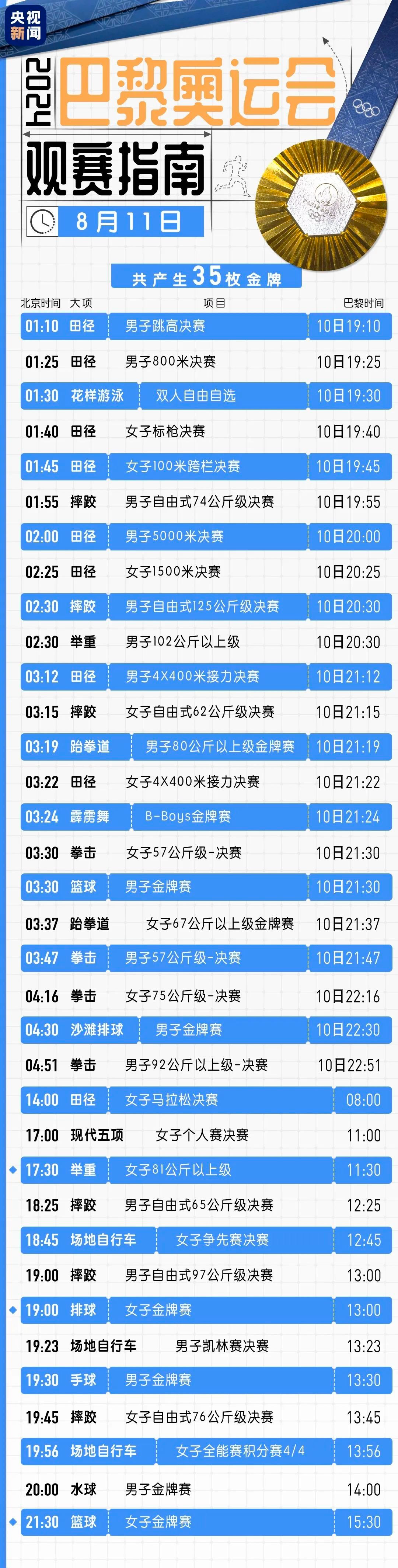 3.北京时间8月11日,第三十三届夏季奥林匹克运动会观赛指南:一起查看↓(央视新闻)
