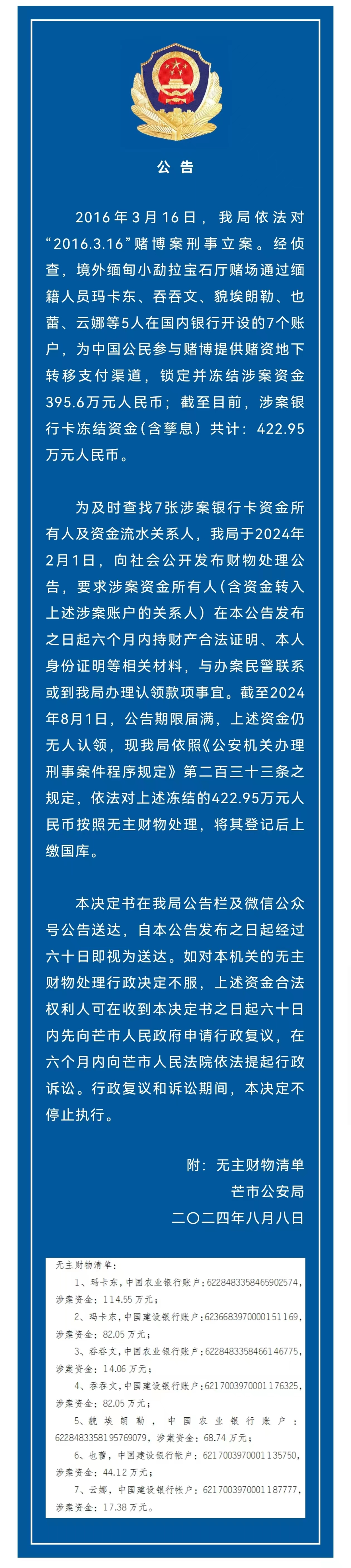 9.422.95万元无人认领!云南一地警方公告:近日,云南德宏傣族景颇族自治州芒市公安局发布关于无主财物处理决定的公告,详情如下↓(云南广播电视台)