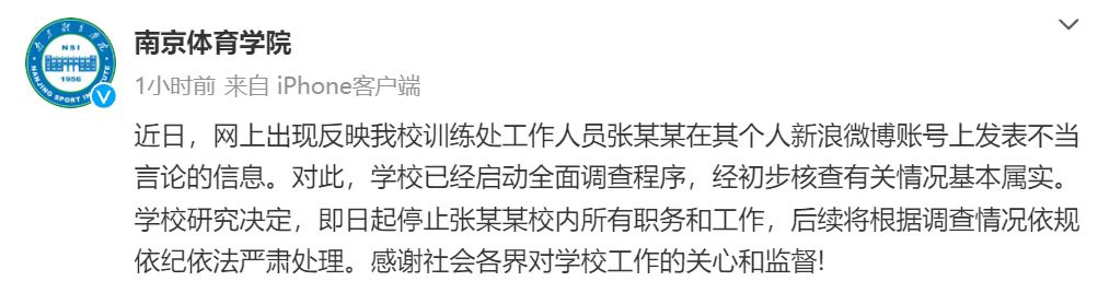 6.“张某某发表不当言论”,南京体育学院回应:25日,南京体育学院回应“工作人员张某某发表不当言论”称,基本属实,停止其校内所有职务和工作。回应如下↓(@南京体育学院)