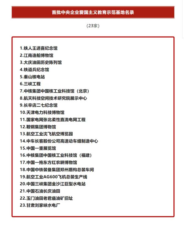 1.名单公布!首批23家:近日,国务院国资委命名发布首批23家中央企业爱国主义教育示范基地,进一步丰富中央企业爱国主义教育载体,推动中央企业深入挖掘展示红色资源的思想内涵和时代价值,传承弘扬爱国主义精神。(新华社)