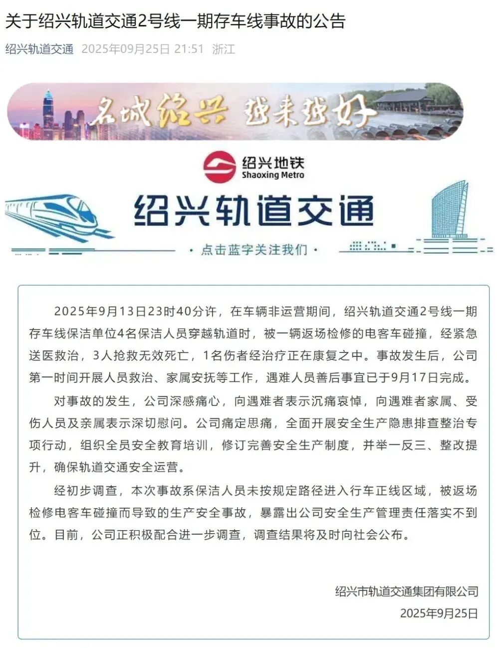 4.绍兴地铁深夜撞人事件,官方通报:9月25日,绍兴轨道交通发布《关于绍兴轨道交通2号线一期存车线事故的公告》,全文如下↓(新华社、人民日报)