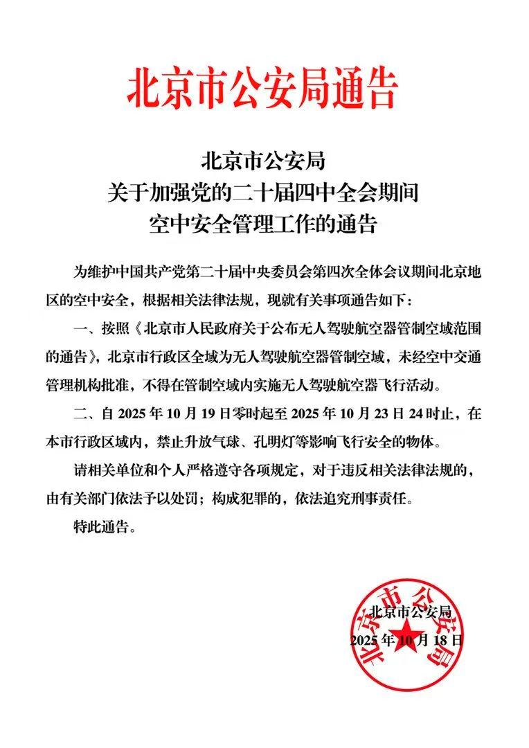 3.北京发布重要通告:据《北京市公安局关于加强党的二十届四中全会期间空中安全管理工作的通告》,为确保中国共产党第二十届中央委员会第四次全体会议期间北京地区的空中安全,10月19日零时起至10月23日24时止,在本市行政区域内,禁止升放气球、孔明灯等影响飞行安全的物体。通告如下↓(参考消息)