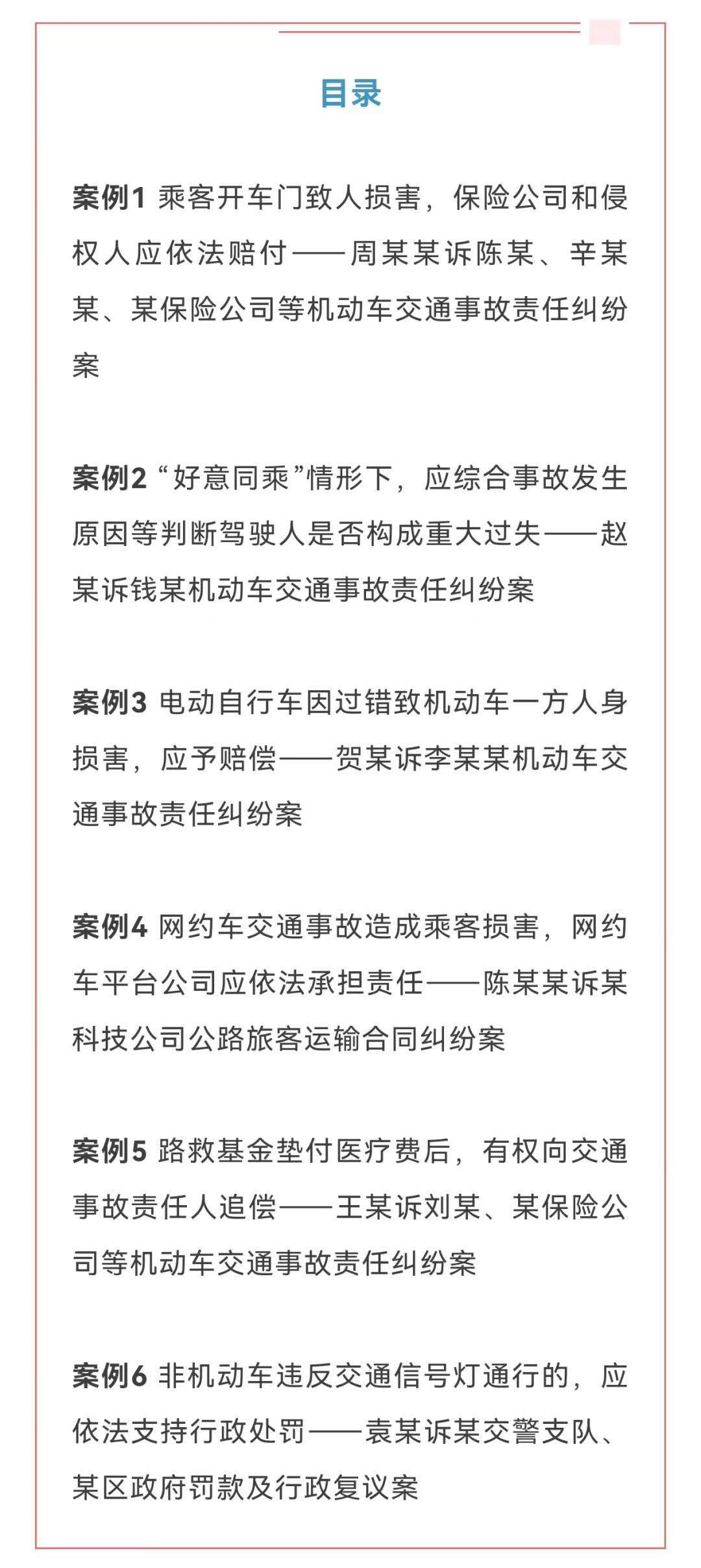 1.最高人民法院发布交通事故责任纠纷典型案例:人民法院坚持人民至上,主动回应道路交通安全新形势新要求,统筹高质量发展和高水平安全,妥善审理各类交通事故责任纠纷案件。为充分发挥典型案例示范引领作用,最高人民法院发布6个交通事故责任纠纷典型案例。(人民法院报)