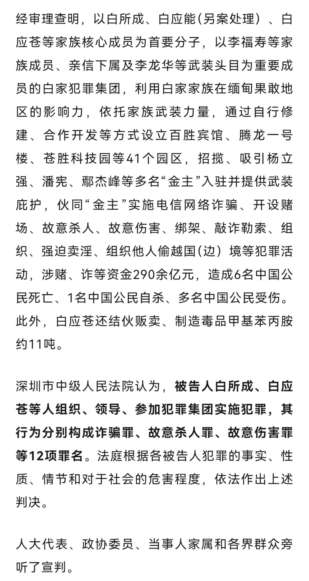 11月4日,广东省深圳市中级人民法院一审公开宣判白家犯罪集团案。对白所成、白应苍、杨立强、胡小姜、陈广益5名被告人判处死刑;对李福寿、李志德2名被告人判处死刑,缓期二年执行;对郭建政、潘宪等5名被告人判处无期徒刑;对李龙华、罗文鼎等9名被告人判处二十年至三年不等有期徒刑,并相应判处罚金、没收财产、驱逐出境等附加刑。详情如下↓(央视新闻)