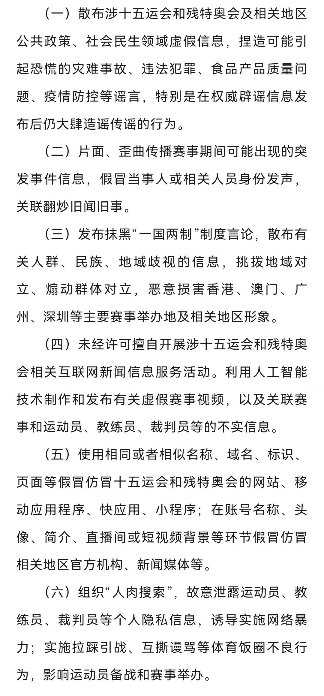 1.事关十五运会和残特奥会,网信部门集中整治6类突出问题:为做好十五运会和残特奥会保障工作,决定自11月4日至12月20日开展“清朗·十五运会和残特奥会网络环境整治”专项行动,集中整治以下6类突出问题。(“网信中国”微信公众号)
