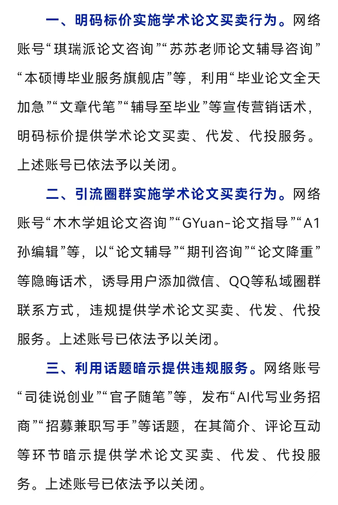 1.中央网信办严打一批涉学术论文买卖违法违规账号:近期,部分网络账号违规提供学术论文买卖、代发、代投服务,严重扰乱网络秩序,污染网络生态。中央网信办依法严惩一批违法违规账号,现将部分典型案例通报如下↓(“网信中国”微信公众号)
