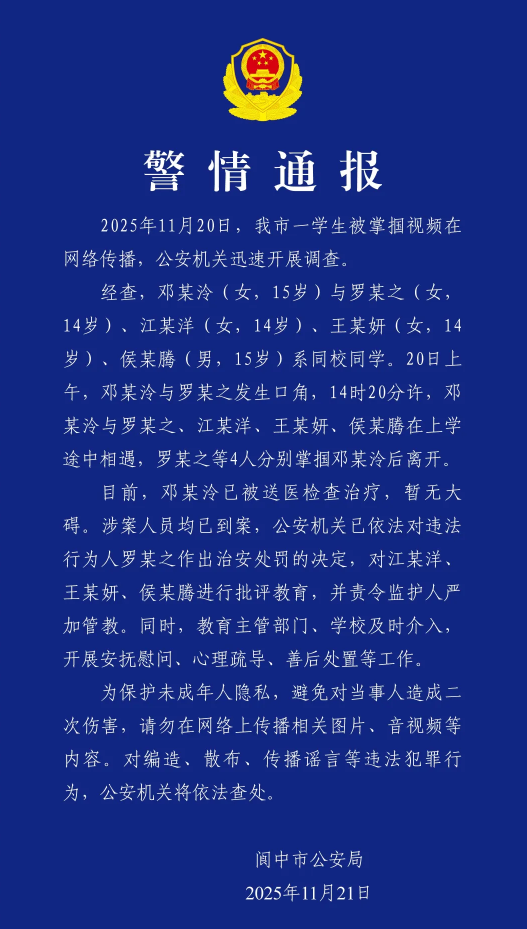 11月20日,四川省阆中市一15岁女生被4名同学掌掴视频在网络传播,公安机关迅速展开调查,11月21日,四川南充阆中市公安局发布警情通报。(央视网、阆中公安)