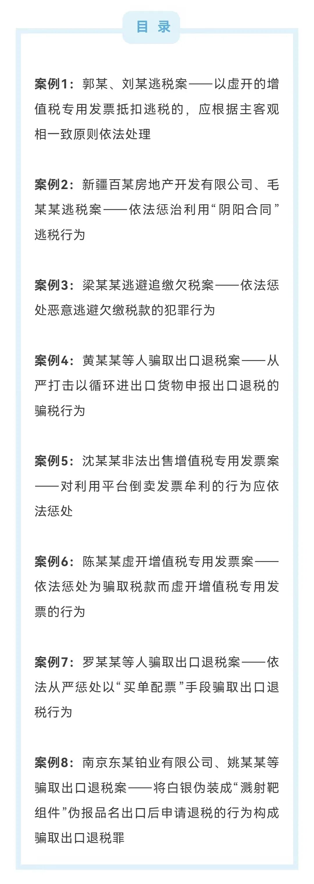 1.最高人民法院发布依法惩治危害税收征管犯罪典型案例:近年来,人民法院充分发挥职能作用,依法审理了一批逃税、逃避追缴欠税、骗取出口退税、虚开增值税专用发票等危害税收征管刑事案件,有力守护国家税收安全。为进一步彰显人民法院依法惩治税收犯罪,维护国家税收安全和市场经济秩序的坚定决心,指导司法裁判,强化惩治效果,引导依法纳税,提高税收遵从,现选取了八个具有典型意义的案例发布。(最高人民法院)