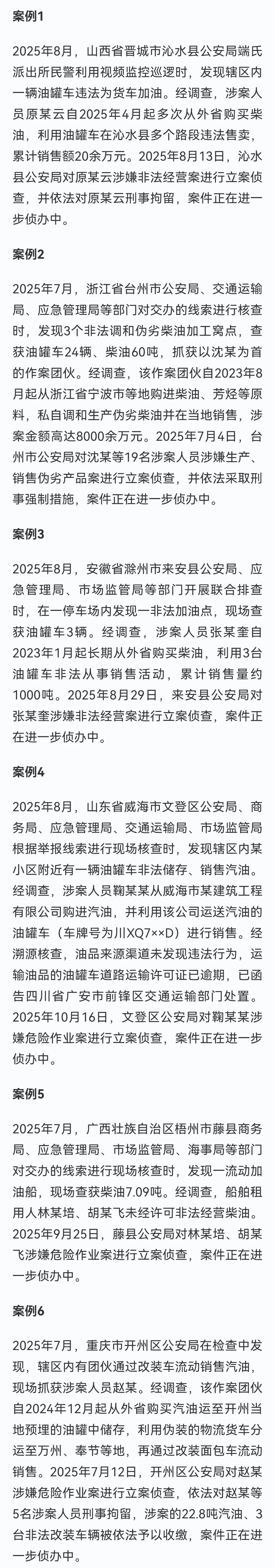 2.国务院安委会办公室再次公布黑加油点“大扫除”专项整治典型案例:为持续深化黑加油点“大扫除”专项整治行动,严厉打击黑加油点等成品油非法违法行为,继今年9月公布一批专项整治典型案例后,国务院安委会办公室近日再次公布6起典型案例。(应急管理部)