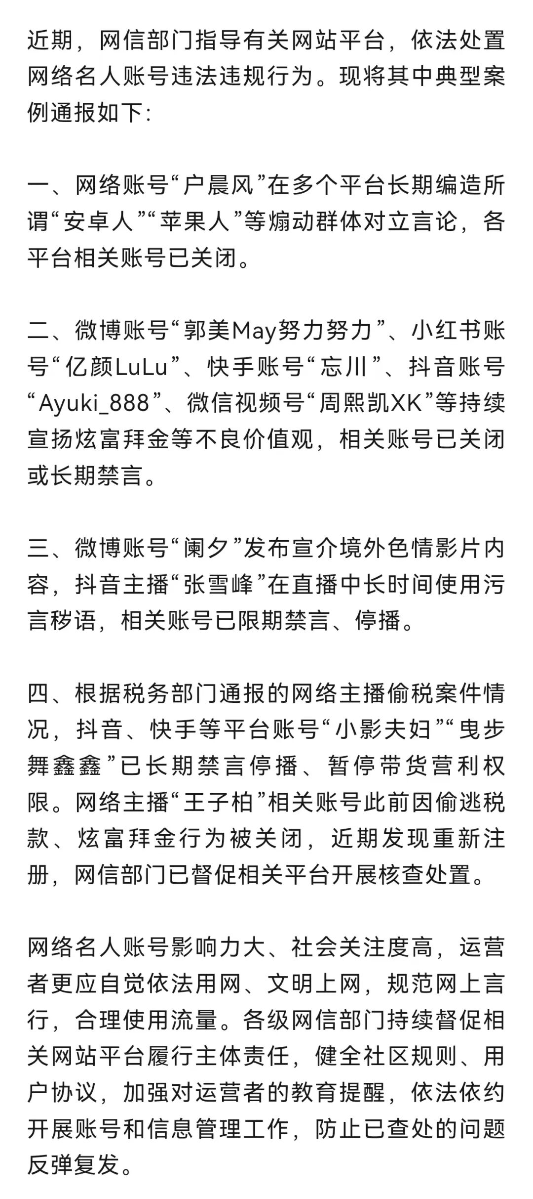 近期,网信部门指导有关网站平台,依法处置网络名人账号违法违规行为。现将其中典型案例通报如下↓(新华社、网信中国)