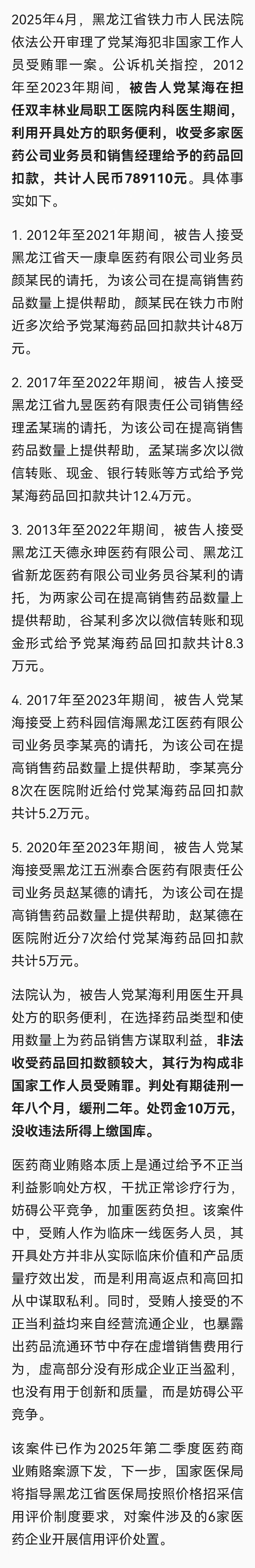 12日,国家医保局公布一起医生受贿案详情。2025年4月,黑龙江省铁力市人民法院依法公开审理了党某海犯非国家工作人员受贿罪一案。公诉机关指控,2012年至2023年期间,被告人党某海在担任双丰林业局职工医院内科医生期间,利用开具处方的职务便利,收受多家医药公司业务员和销售经理给予的药品回扣款,共计人民币789110元。具体事实如下↓(央视新闻)