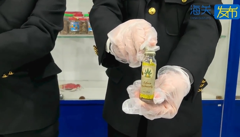 近日,太原海关所属太原机场海关关员在对入境旅客行李进行监管时,发现一名选择“无申报通道”的旅客的托运行李机检图像异常。经关员开箱查验,发现该名旅客行李箱内有大麻药油一瓶,含量为20毫升。这瓶药油的包装上有明显的大麻叶标识。经取样送检,检出四氢大麻酚等成分。目前,该案件已移交海关缉私部门处理。(海关发布)