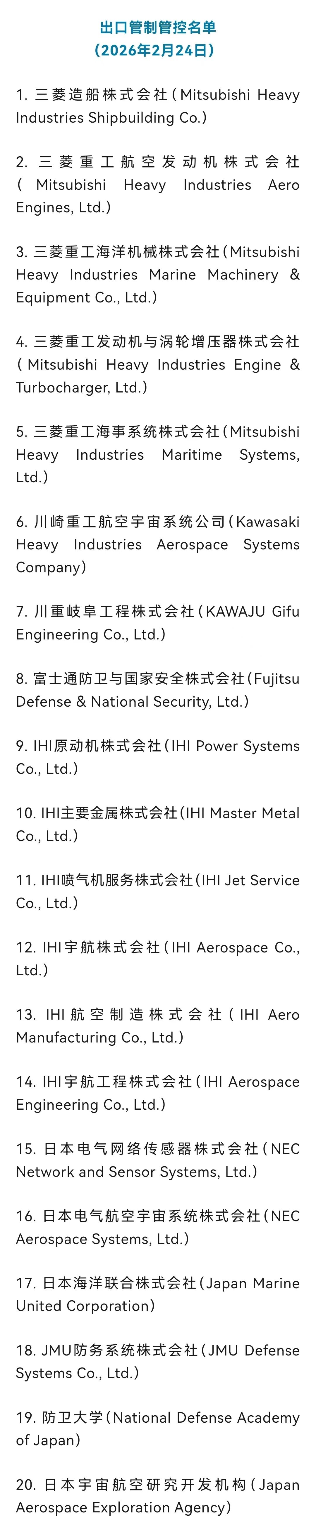 2.商务部:将20家日本实体列入出口管制管控名单 商务部24日发布公告,公布将20家日本实体列入出口管制管控名单。根据《中华人民共和国出口管制法》和《中华人民共和国两用物项出口管制条例》等法律法规有关规定,为维护国家安全和利益,履行防扩散等国际义务,决定将三菱造船株式会社等参与提升日本军事实力的20家日本实体列入出口管制管控名单。(央视新闻)