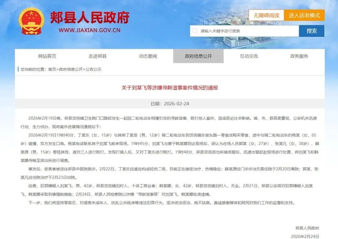 近日,河南省平顶山市“15岁女孩被当街暴打”事件引发关注。21日,平顶山市郏县茨芭镇人民政府发布情况通报称,公安机关已对犯罪嫌疑人刘某飞、韩某娜采取刑事强制措施。24日,平顶山市郏县人民政府发布关于刘某飞等涉嫌寻衅滋事案件情况的通报↓(新华网)