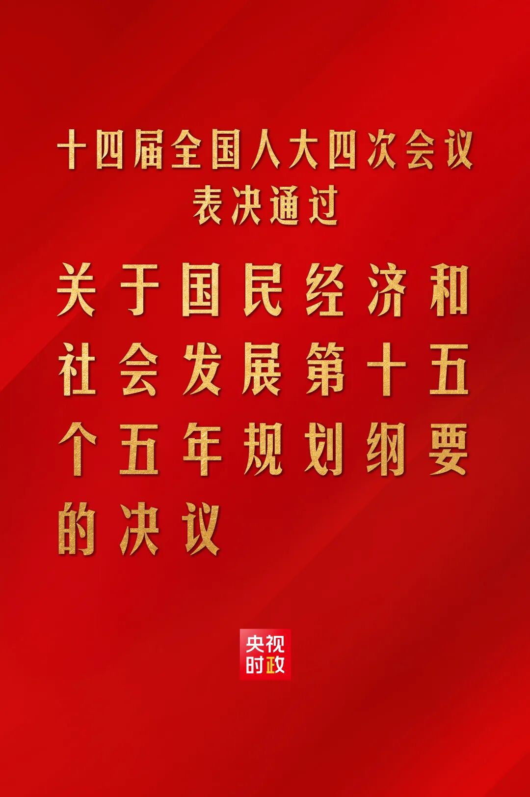 1.“十五五”规划纲要,表决通过:十四届全国人大四次会议表决通过关于国民经济和社会发展第十五个五年规划纲要的决议。(央视新闻)