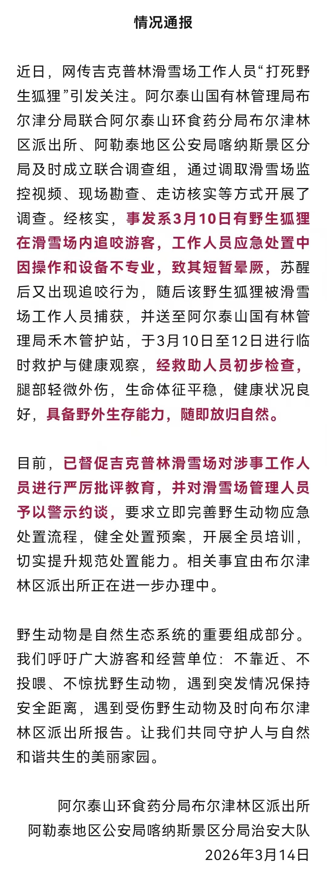 5.新疆阿勒泰咬人狐狸被滑雪场员工打死?警方通报:近日,新疆维吾尔自治区一滑雪场发生狐狸追咬游客事件,后传出它被工作人员当场打死,引发关注。阿尔泰山环食药分局布尔津林区派出所、阿勒泰地区公安局喀纳斯景区分局治安大队3月14日发布一则通报。如下↓(光明日报)