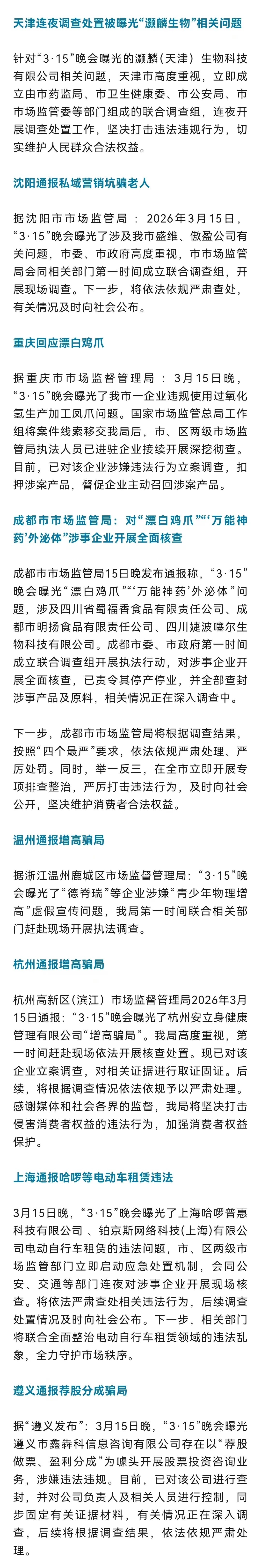 3月15日晚,针对2026年“3·15”晚会曝光的“漂白鸡爪”“万能神药”“增高营销”等违法行为,市场监管总局迅速启动应急处置机制,部署开展执法行动,全力维护消费者合法权益,查处情况将及时向社会公布。多地连夜发布情况通报,对相关涉事企业进行查处。(新华社)