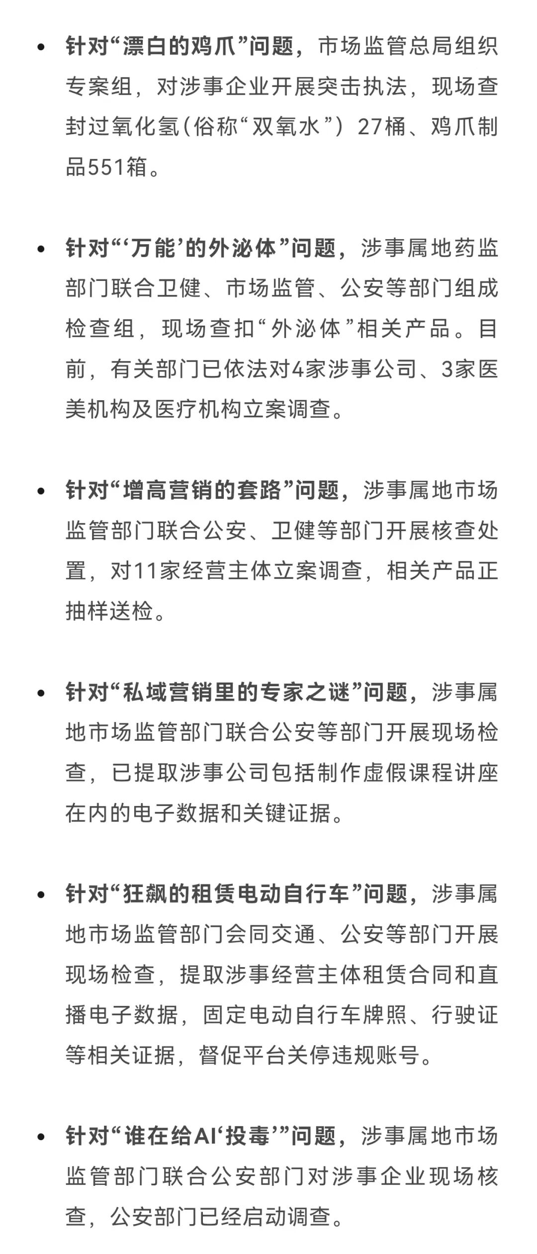 1.针对“漂白鸡爪”等问题,市场监管总局最新通报:近日,市场监管总局召开2026年一季度例行新闻发布会。会上通报称,针对“3·15”晚会曝光的市场监管领域违法问题,市场监管总局迅速部署,依法从严从快查处,并对相关地方政府和市场监管部门开展约谈和挂牌督办,坚决维护消费者合法权益。目前各项执法行动已取得以下阶段性进展↓(人民网)