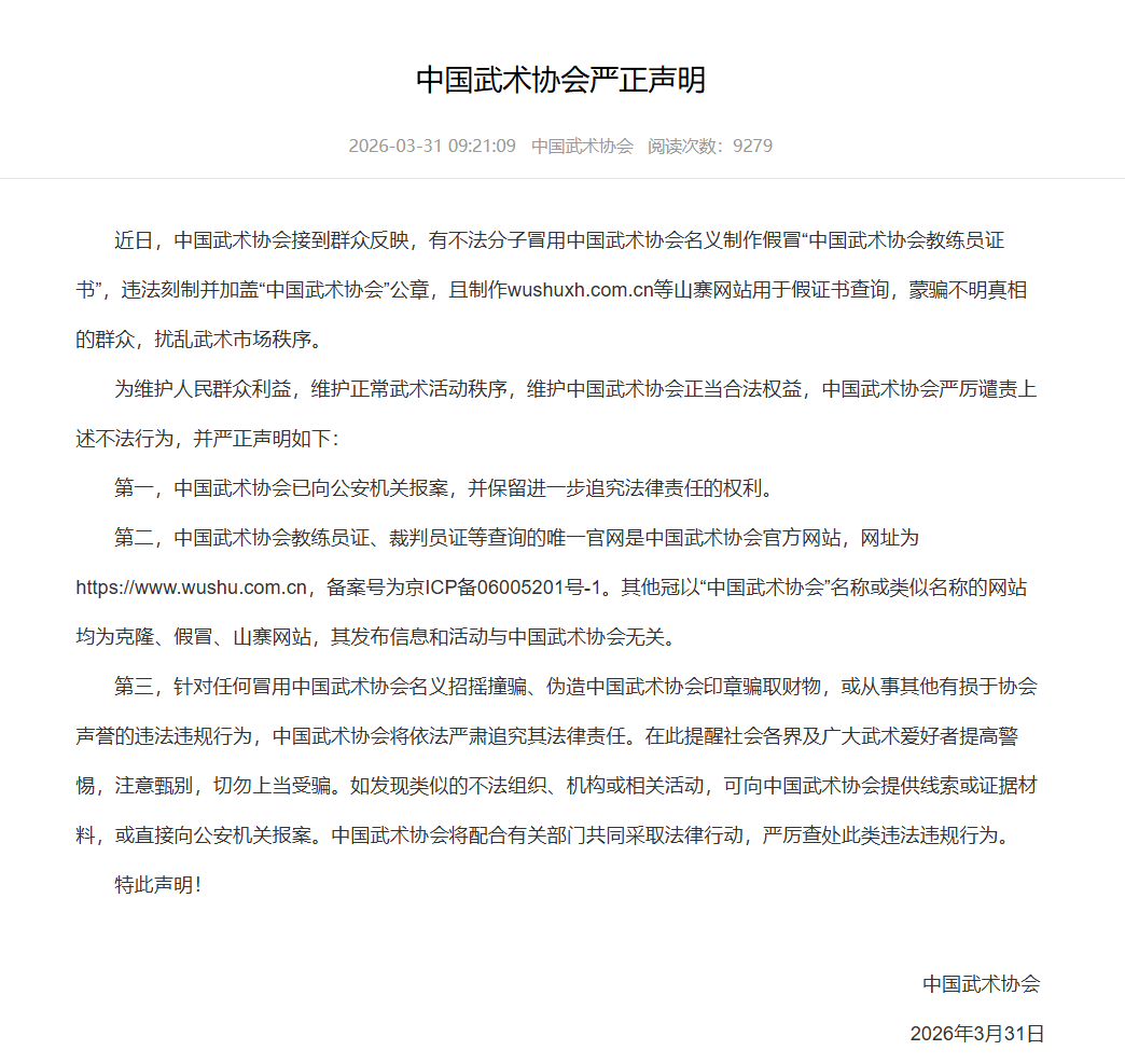 5.中国武术协会发布严正声明:近日,中国武术协会接到群众反映,有不法分子冒用中国武术协会名义制作假冒“中国武术协会教练员证书”,违法刻制并加盖“中国武术协会”公章,且制作wushuxh.com.cn等山寨网站用于假证书查询,蒙骗不明真相的群众,扰乱武术市场秩序。3月31日,中国武术协会发布严正声明。(央广网)