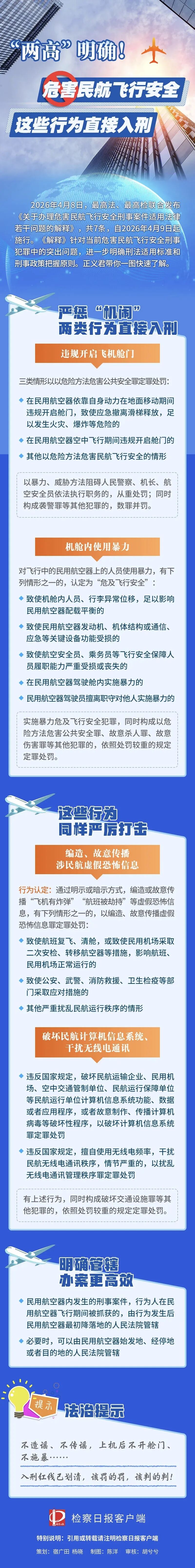2.这些危害民航飞行安全的行为直接入刑:近日,最高人民法院,最高人民检察院联合发布《关于办理危害民航飞行安全刑事案件适用法律若干问题的解释》,共7条,自2026年4月9日起施行。带你一图快速了解↓(检察日报客户端)
