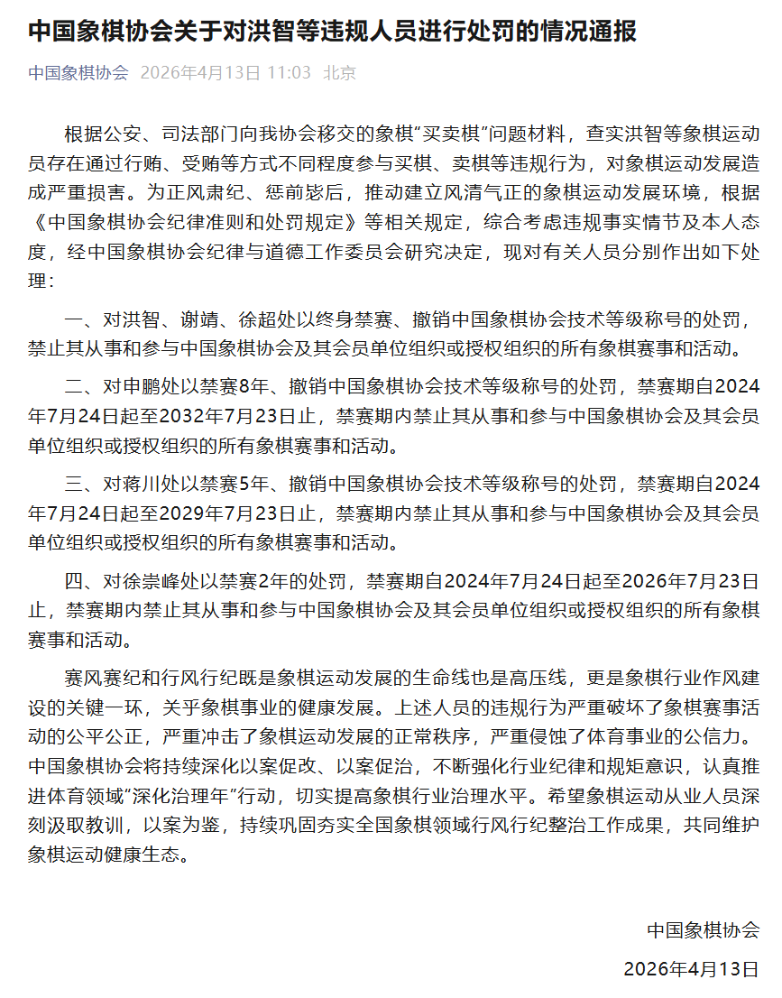 针对象棋“买卖棋”违规行为,中国象棋协会13日发布对洪智等违规人员进行处罚的情况通报,通报如下↓(央视网、中国象棋协会)
