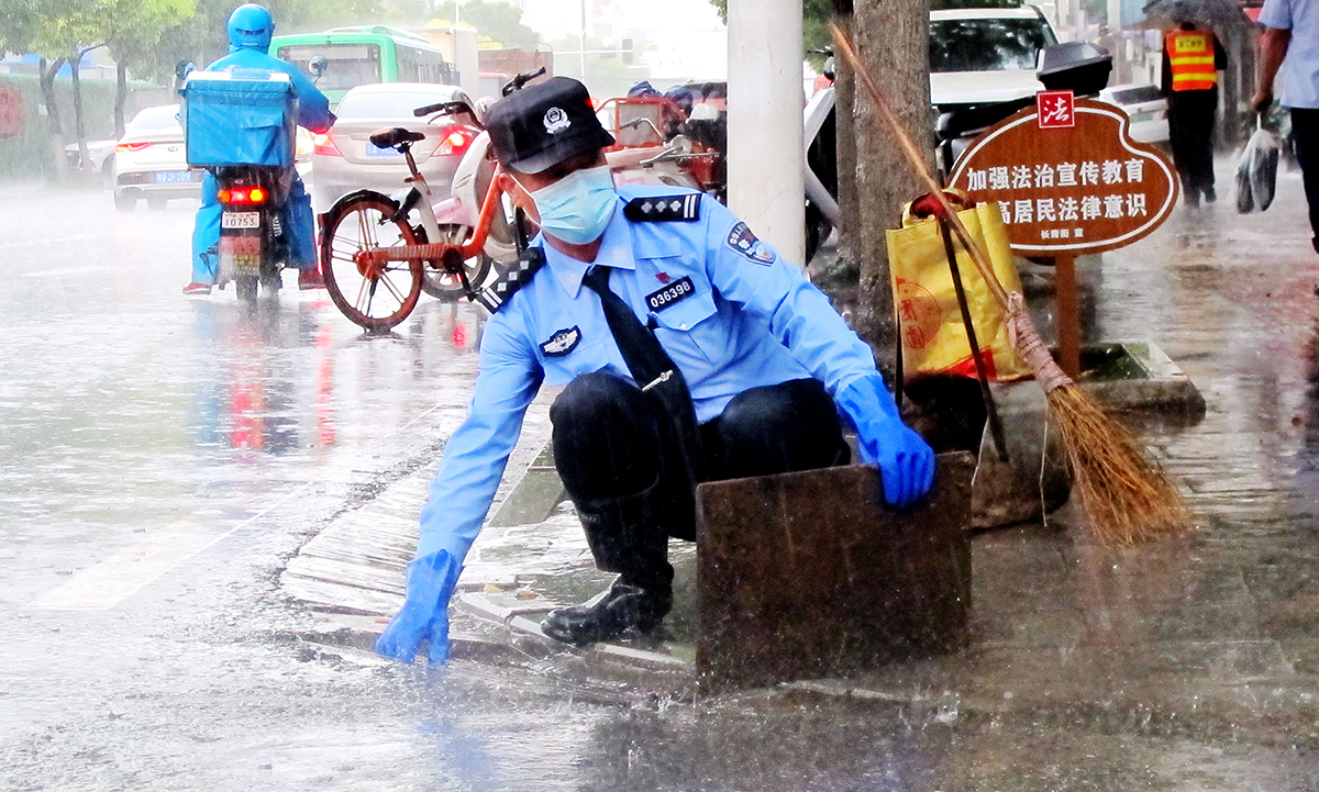 5月15日,特大雷暴雨及大风气象灾害袭击武汉,湖北省武汉市公安局东西湖区分局长青街派出所团结社区警务室民警积极应对灾害气象天气。