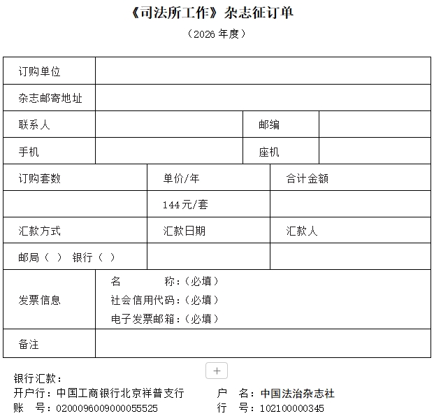 ★若不能进行在线提交订单,请将本征订单填写完整后与汇款凭证一并发邮件至sfsgzfxb@moj.gov.cn或添加微信13681283507/13681570831后发送电子版征订单与汇款凭证。
