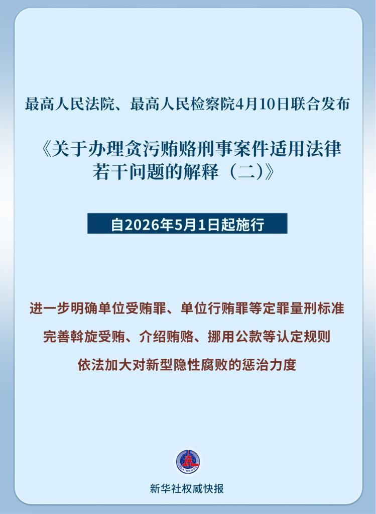 最高人民法院、最高人民检察院4月10日联合发布《关于办理贪污贿赂刑事案件适用法律若干问题的解释(二)》,自2026年5月1日起施行。
