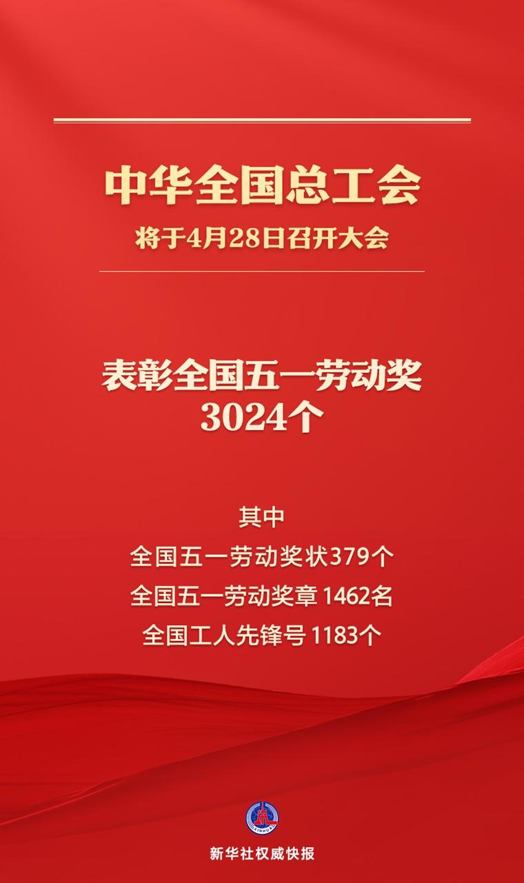新华社北京4月27日电(记者樊曦)“五一”国际劳动节即将到来。记者27日从中华全国总工会获悉,全国总工会将于4月28日召开庆祝“五一”国际劳动节暨全国五一劳动奖表彰大会,届时将表彰全国五一劳动奖3024个,其中全国五一劳动奖状379个、全国五一劳动奖章1462名、全国工人先锋号1183个。
