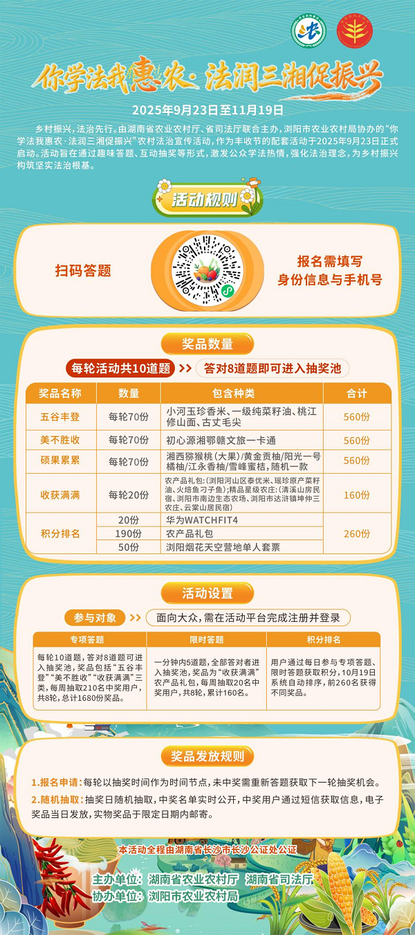 据悉,该活动自即日起至11月19日16:00,面向全社会公众开放,无论城市居民还是农村群众,均可通过指定活动平台参与答题抽奖。活动期间将开展八轮抽奖,全程由湖南省长沙市长沙公证处进行公证,确保活动的公平、公正、公开。每轮抽奖都会从符合条件的参与者中随机抽取幸运者,让每位参与者都有机会赢取丰厚奖品。