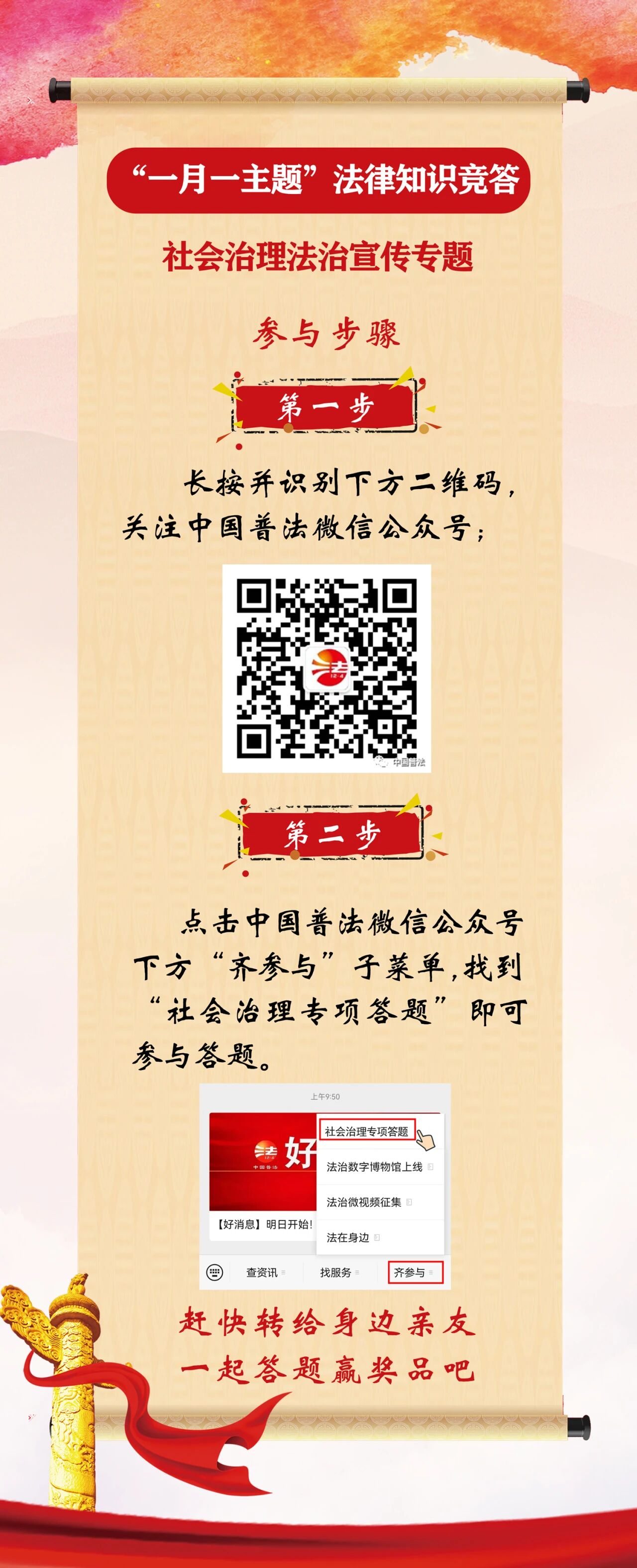 中国普法微信公众号于2025年10月1日至20日组织开展“一月一主题”法律知识竞答•社会治理法治宣传专题活动。