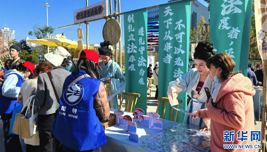 “宪承古今 法启未来”五大互动板块成为本次活动的亮点。在法治互动区,市民扫码就能参与闯关游戏,5个关卡涵盖“宪法知识问答”“公民的基本权利和义务”等内容,紧扣宪法核心要点,让市民在潜移默化中深化对宪法的认知。法治集市区以古代元素为设计基调,墨宝书签、折扇、香囊等静静陈列,勾勒出中华法治文明的千年脉络,彰显宪法精神的历史传承。法治咨询区兼“八五”普法成果展示区前,“法律明白人”、普法志愿者和专业律师组成的服务团队现场答疑解惑,同步展示云南省16个州市的普法亮点成果。法治展望区兼“九五”普法展望区里,AI法律服务机器人提供智能咨询,普法形式征集墙收集市民建议,科技赋能让“九五”普法的创新方向清晰可见。法治拍照打卡区,市民们在古今法治元素布景前留影,通过社交分享让普法传播半径持续扩大。