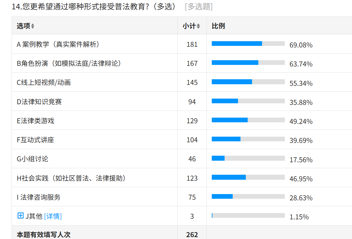 在调查问卷中,针对“您更希望通过哪种形式接受普法教育?”的问题,选择结果如图三所示。从调查问卷结果来看,传统的讲座类普法方式、法律知识竞赛及法律咨询式普法占比都不是太高,比较受欢迎的普法方式依次是:真实案件解析式案例教学、角色扮演、短视频/动画、法律类游戏、社会实践(如社区普法、法律援助)类普法方式。这些普法方式因具有趣味性、生动性、增加了参与体验感从而比较受年轻人的欢迎。