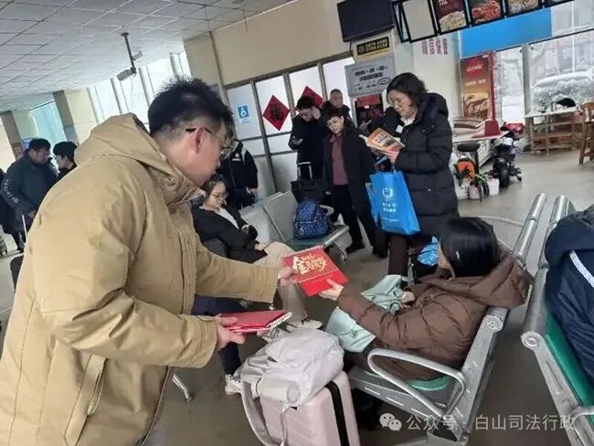 一份法治礼,温暖回家路。在高铁站候车大厅,白山市司法局、浑江区司法局组织普法工作者精心准备“新春法治礼包”,将法律知识融入返乡旅途。礼包内含《致返乡务工朋友们的法治安全温馨提示》信函、普法书籍及实用宣传品,让法律知识触手可及,帮助返乡务工人员“把法治意识带在身边”。