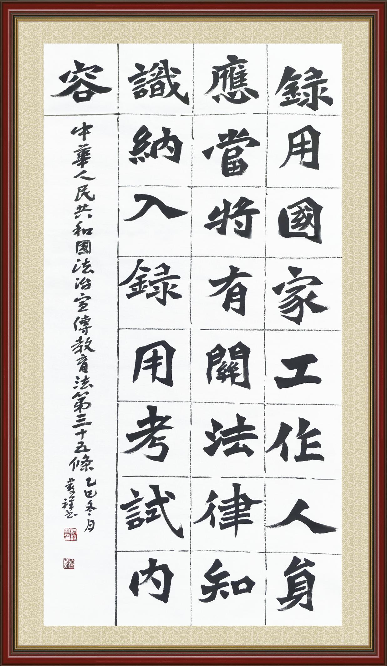 2020年7月11日,由法治日报社主办的“书·法”系列活动正式启动,先后书写《中华人民共和国民法典》《中华人民共和国宪法》《中华人民共和国民营经济促进法》等21部法律法规。