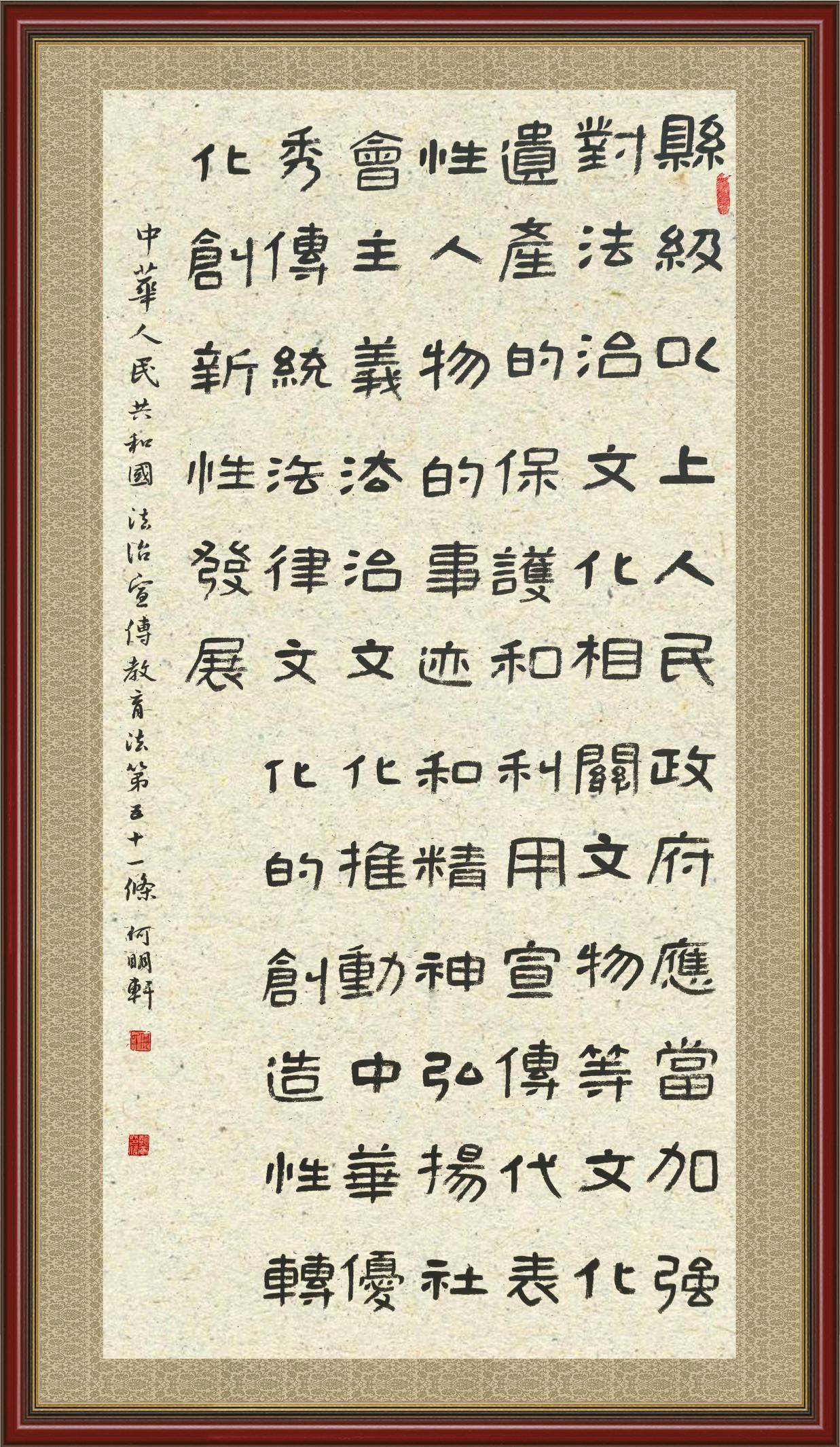 2020年7月11日,由法治日报社主办的“书·法”系列活动正式启动,先后书写《中华人民共和国民法典》《中华人民共和国宪法》《中华人民共和国民营经济促进法》等21部法律法规。