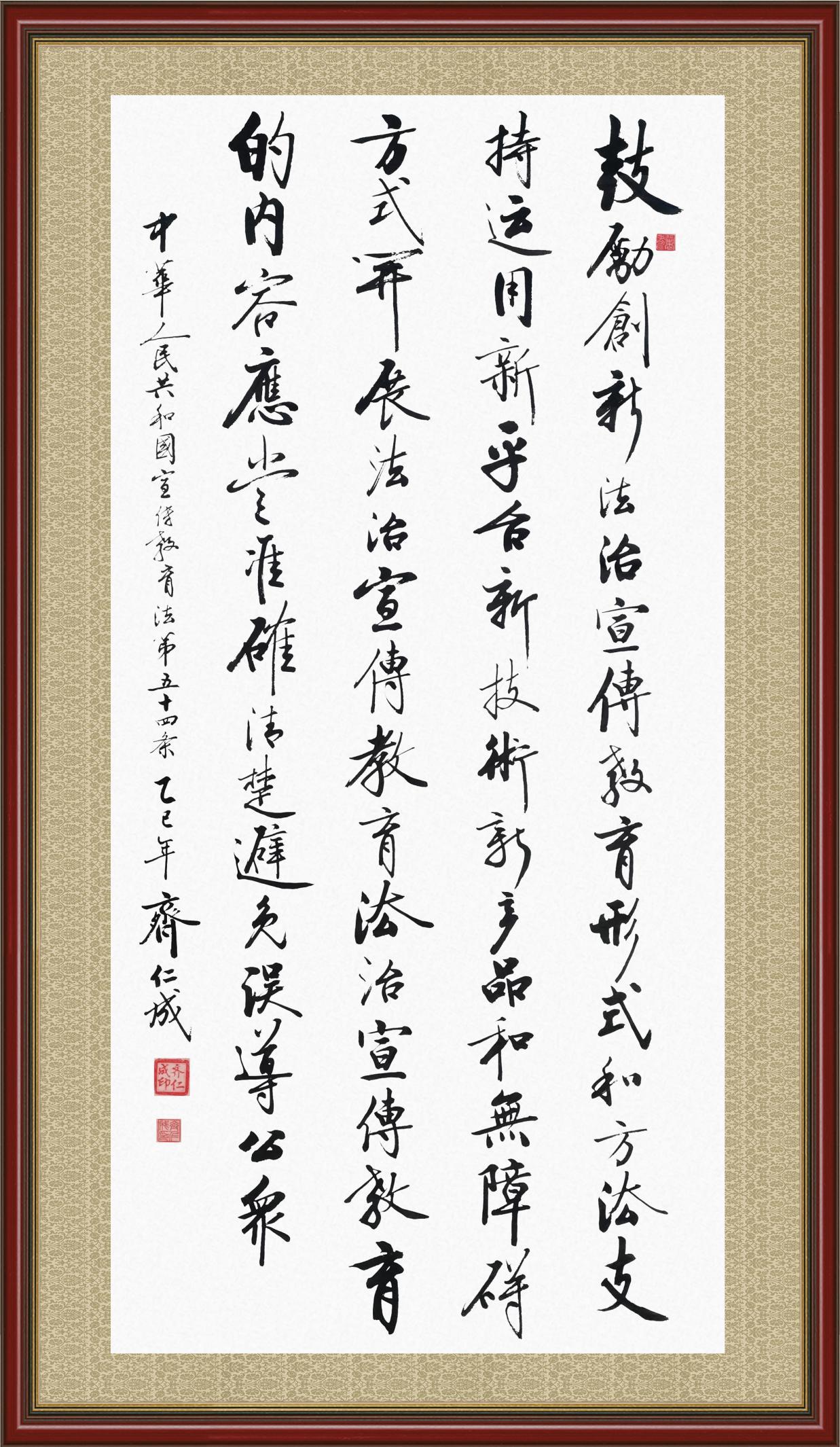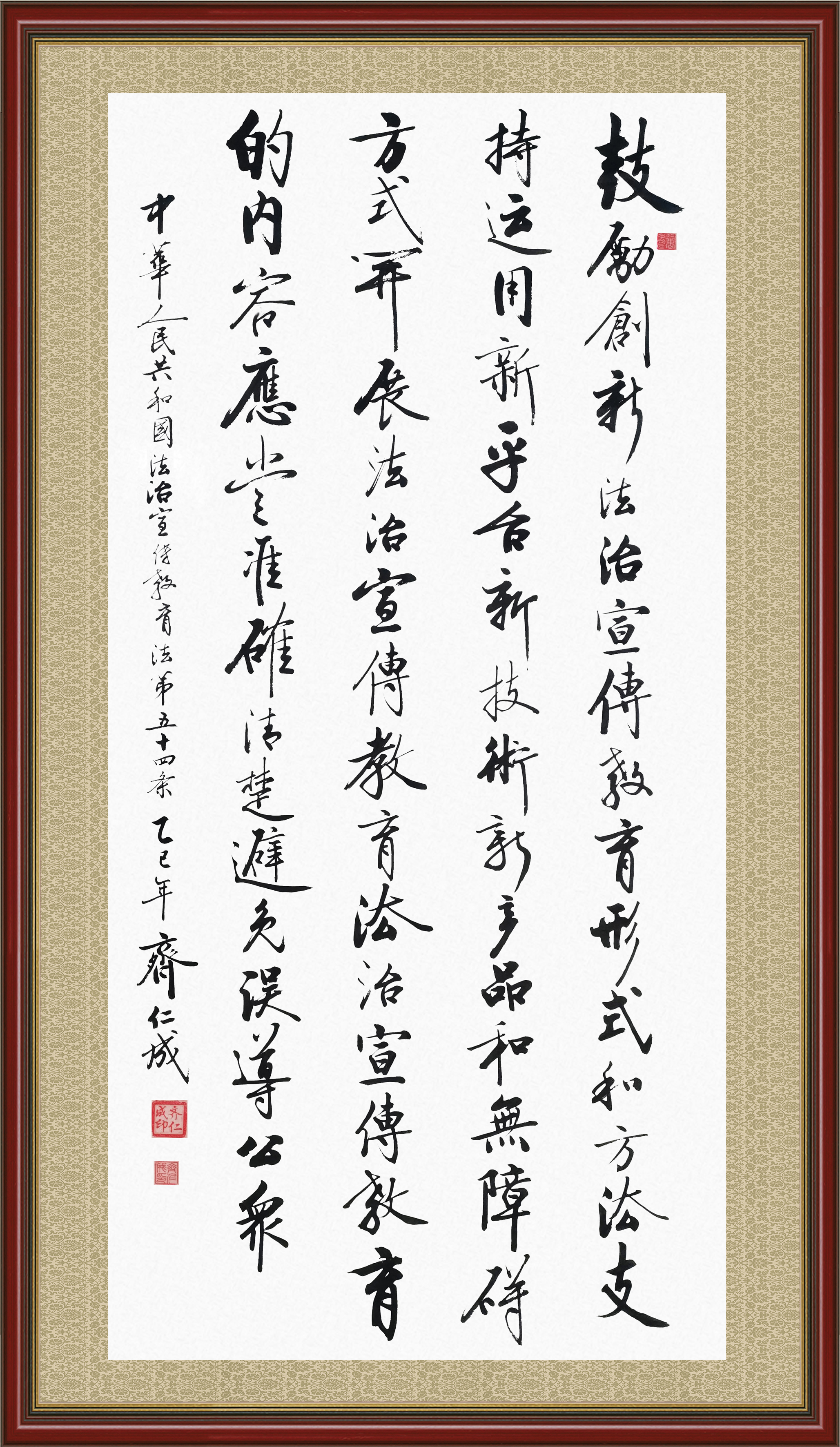 2020年7月11日,由法治日报社主办的“书·法”系列活动正式启动,先后书写《中华人民共和国民法典》《中华人民共和国宪法》《中华人民共和国民营经济促进法》等21部法律法规。