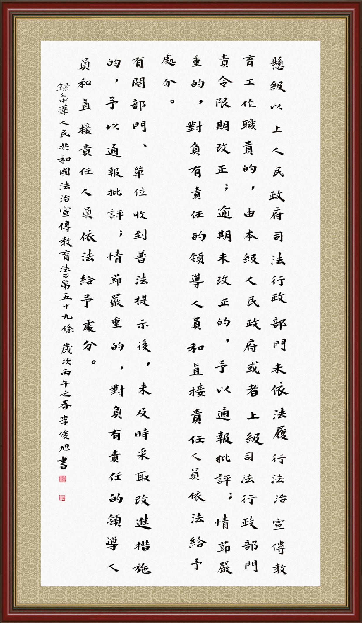 2020年7月11日,由法治日报社主办的“书·法”系列活动正式启动,先后书写《中华人民共和国民法典》《中华人民共和国宪法》《中华人民共和国民营经济促进法》等21部法律法规。