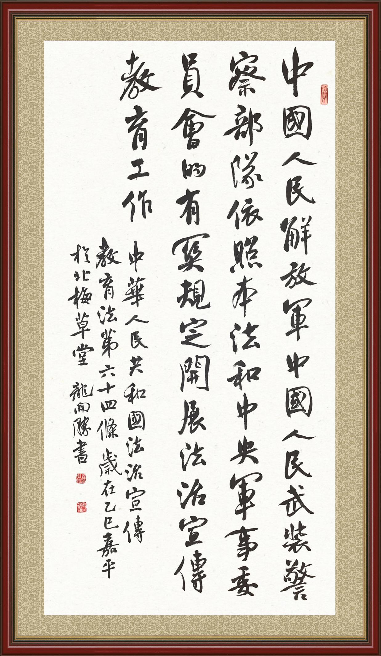 2020年7月11日,由法治日报社主办的“书·法”系列活动正式启动,先后书写《中华人民共和国民法典》《中华人民共和国宪法》《中华人民共和国民营经济促进法》等21部法律法规。